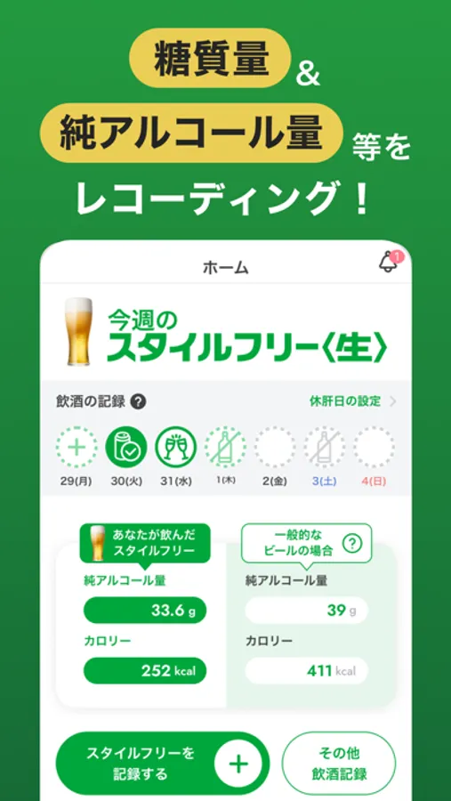 さらにアサヒスタイルフリー〈生〉を飲酒記録すると、通常のビール類(※1)との摂取糖質量・純アルコール量・カロリーの比較をホーム画面で簡単に確認できます。