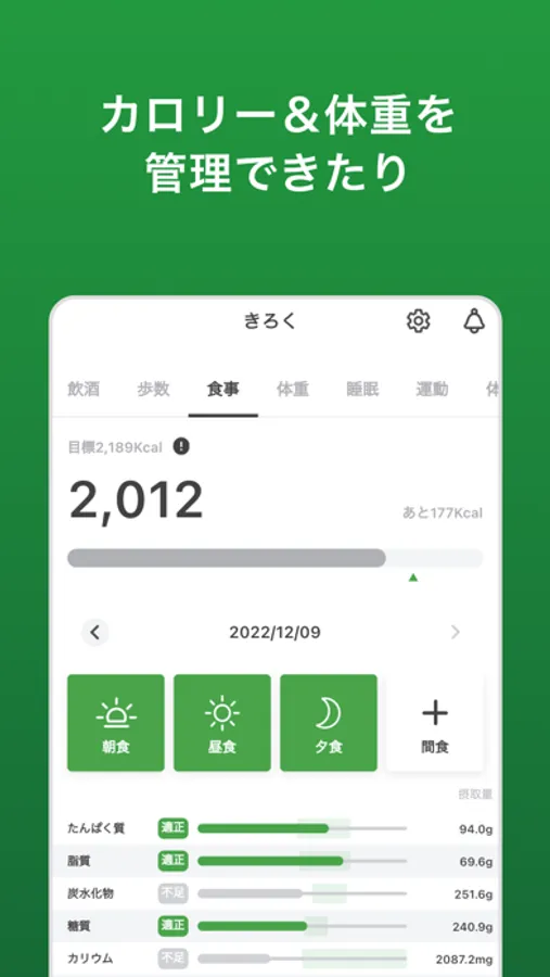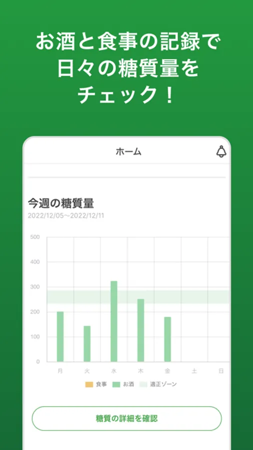 【糖質】食事や飲酒記録から、一日の摂取糖質量が一目で分かります。