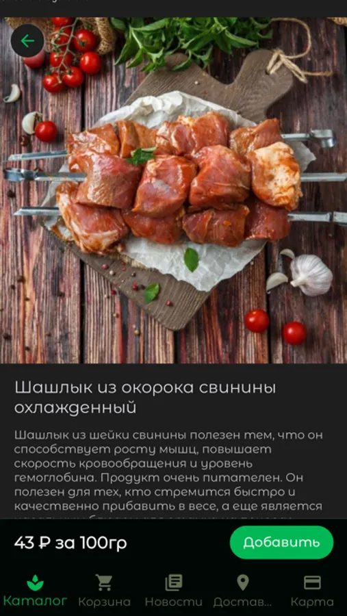 В приложении вы найдете готовую еду, фрукты и овощи, молочную продукцию, охлаждённое мясо, натуральные полуфабрикаты собственного производства, товары правильного питания, мясные деликатесы и много товаров местного производства, не представленные в сетевых магазинах. Здесь есть всё, чтобы заказать в одном месте и не тратить время на дорогу за покупками.