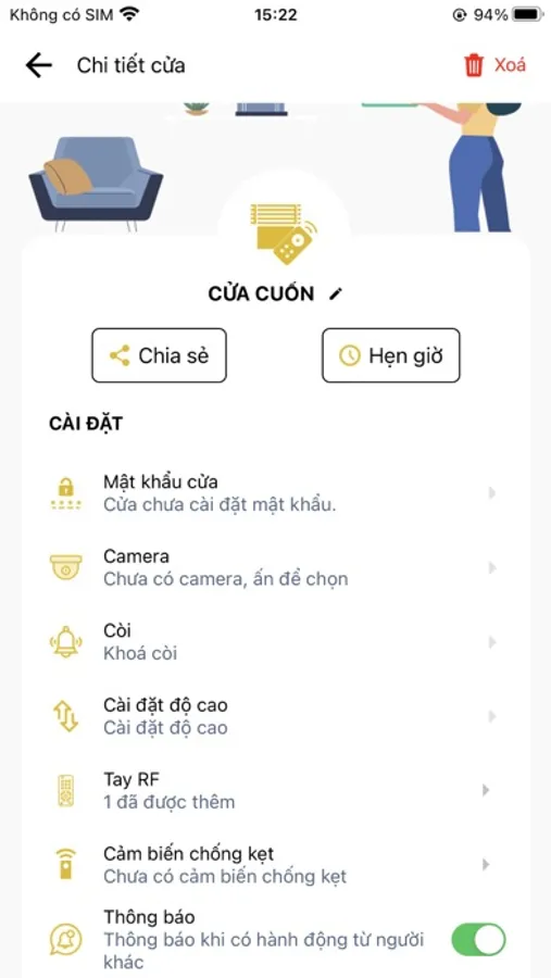 Ứng dụng cho phép thêm thiết bị cửa cuốn, điều khiển các thao tác cửa cuốn như: mở , đóng, dừng cửa, khóa cửa, hẹn giờ mở cửa - khoá cửa.