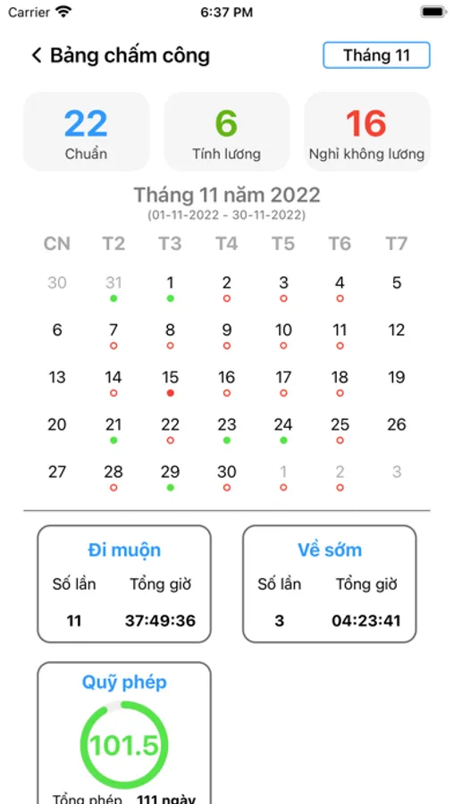 - Xem bảng chấm công theo thời gian thực; Quản lý ngày phép năm