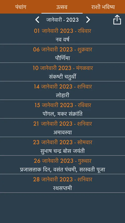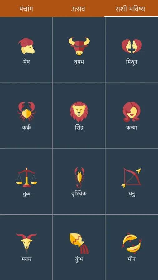 3) Swipe between Panchang, Festivals and Rashi Bhavishya tabs to view detailed Marathi panchang results or festivals list or Marathi horoscope details.