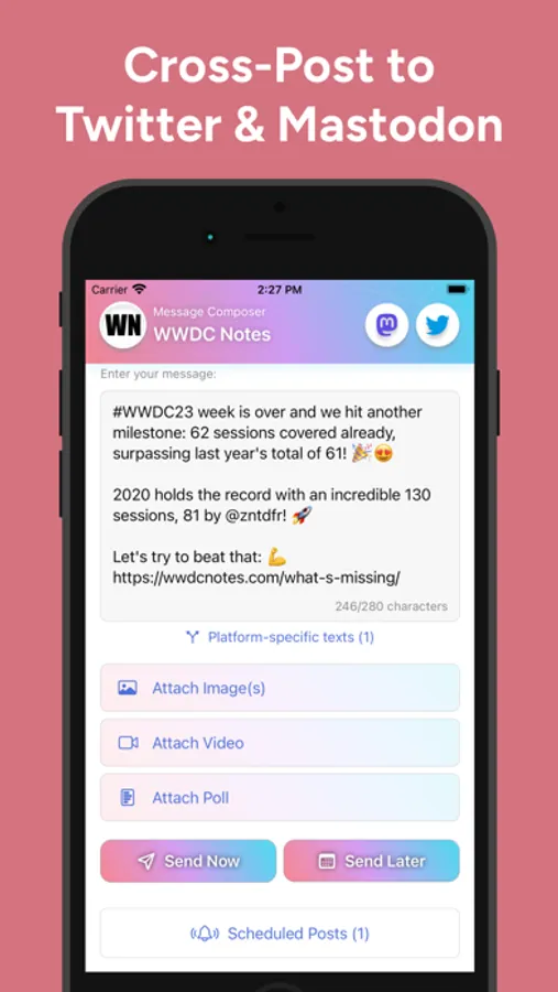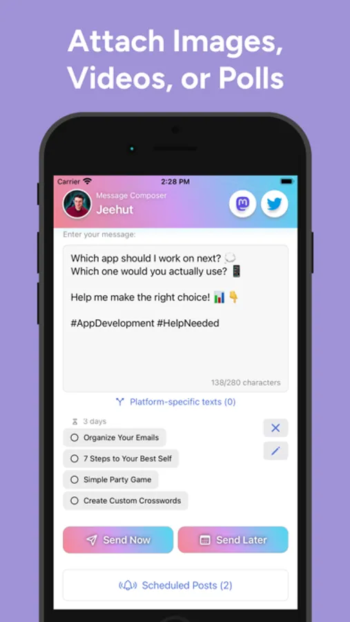 Seamlessly cross-post your updates, images, videos, and polls to Twitter and Mastodon with just a few taps. With the added feature of scheduling posts to send at a later time, Twoot it! empowers you to stay ahead of your social media game like never before!