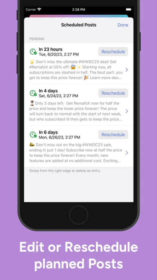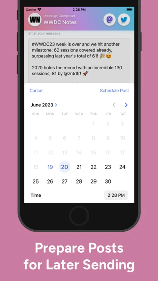 Take control of your social media presence by scheduling posts to be sent at a later time. With Twoot it!, you can plan and organize your content in advance, ensuring a consistent and timely delivery across platforms.
