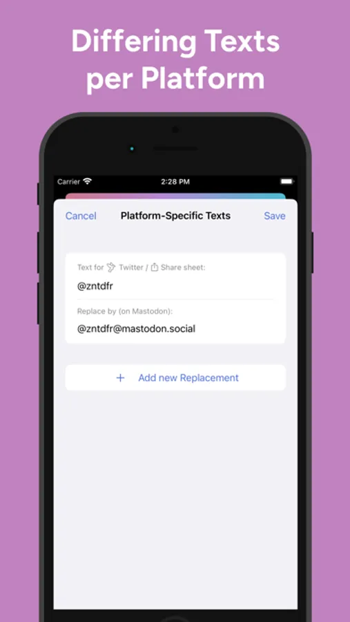 Twoot it! enables you to create platform-specific text replacements, allowing you to customize your posts for Twitter and Mastodon. This feature empowers you to provide different handles, mentions, hashtags, or even entire phrases specific to each platform, ensuring your messages resonate perfectly with your target audience and preventing dead links on one of the platforms.