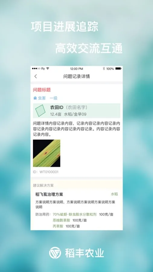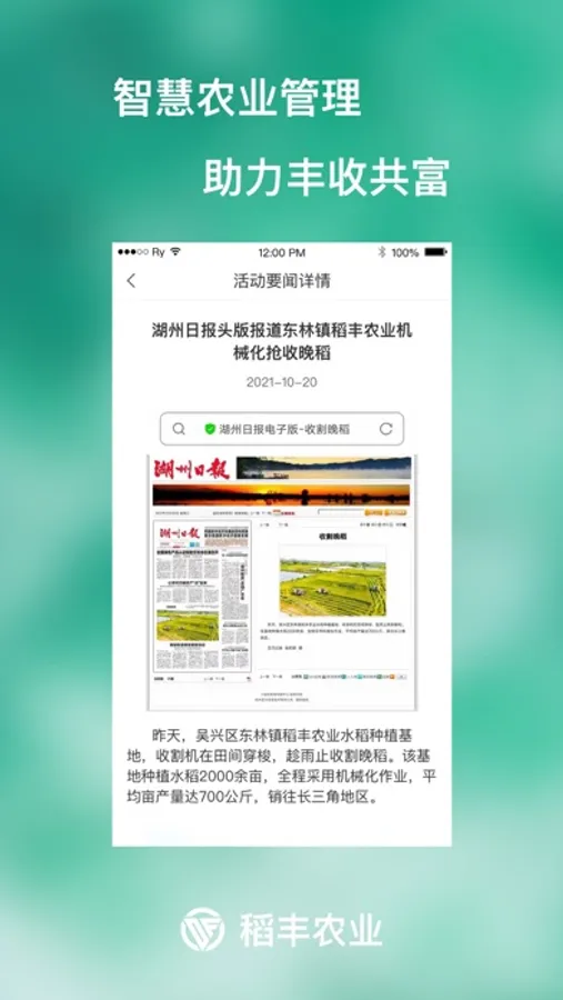 本产品是浙江湖州市吴兴区稻丰农业开发有限公司提供服务,由浙江睿耘科技有限公司提供技术支持,联合打造的一款专门服务于农业客户的APP。