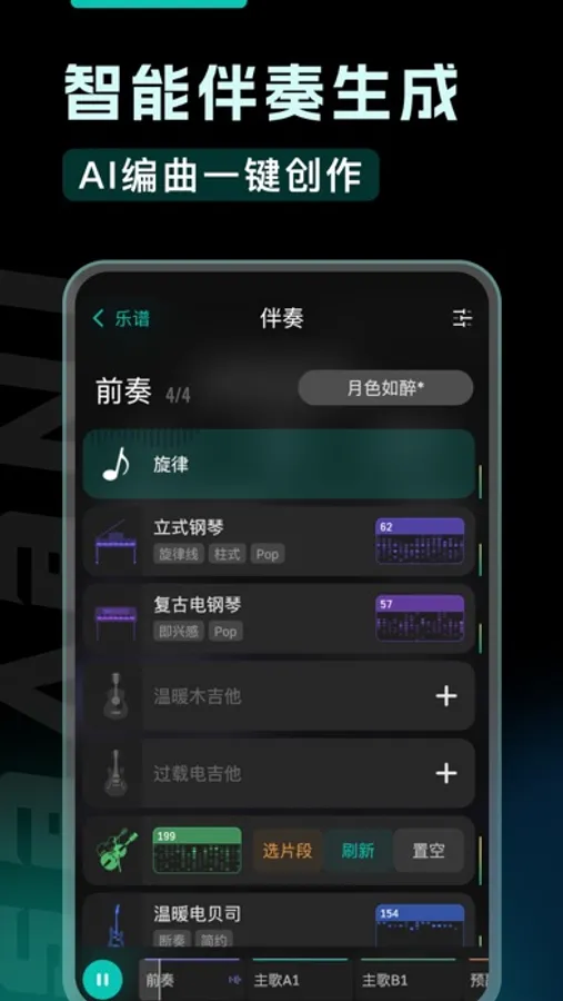 音乐制作门槛高?想要编曲却没有灵感?在和弦派的伴奏页面,你可以随意搭配乐器组合,一键生成专业级乐器演奏,人人都可以成为音乐制作人。