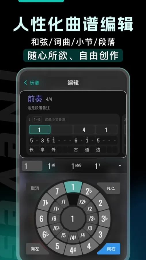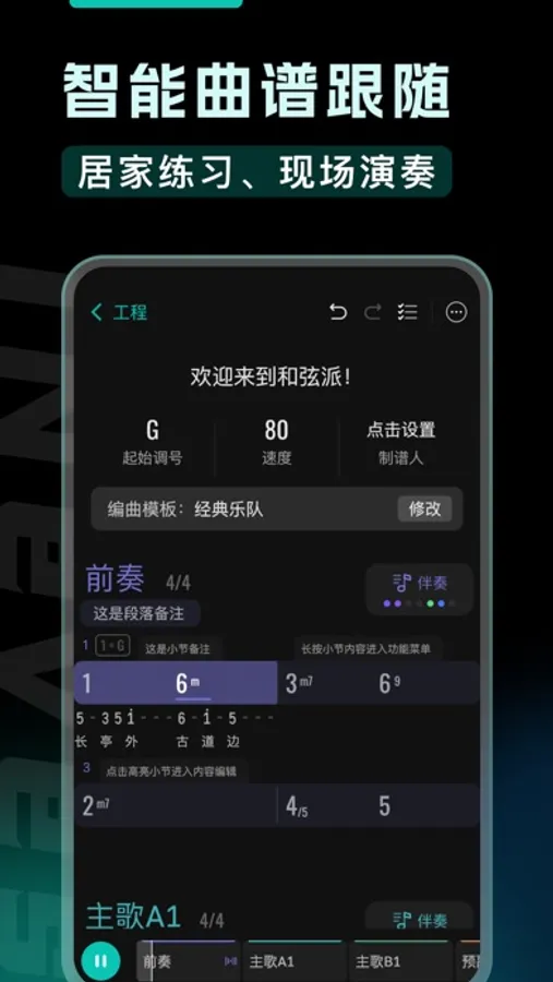 旋律歌词、和声进行、段落小节,和弦派独特的人性化编辑模式让你可以从零开始编辑出独一无二的音乐工程,配合AI伴奏生成,直接生成商业音乐,随时随地记录灵感。