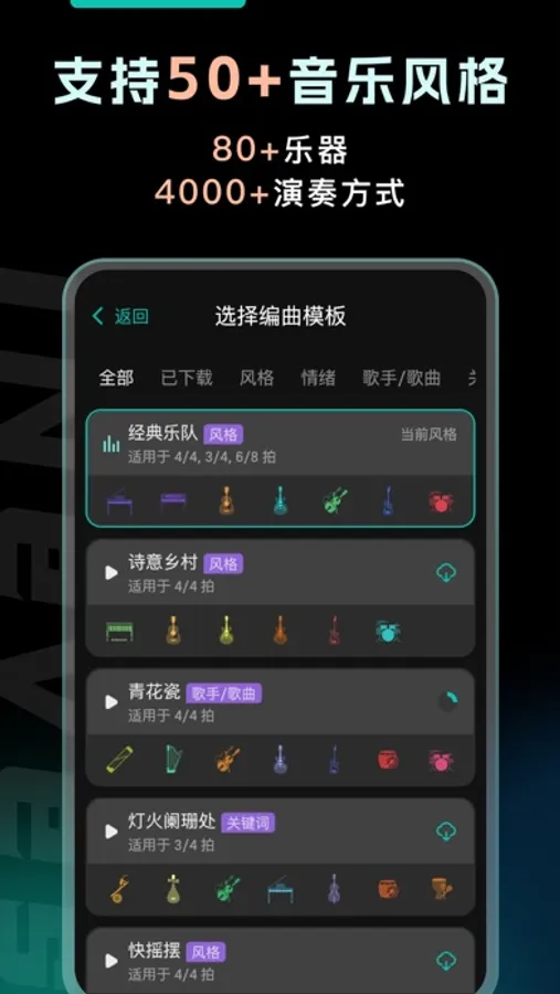 支持多风格编曲模板切换。上百种音色组合×上千种乐器奏法任你搭配,激发音乐灵感,创造无限可能,让你的每一个音乐作品亮点满满。