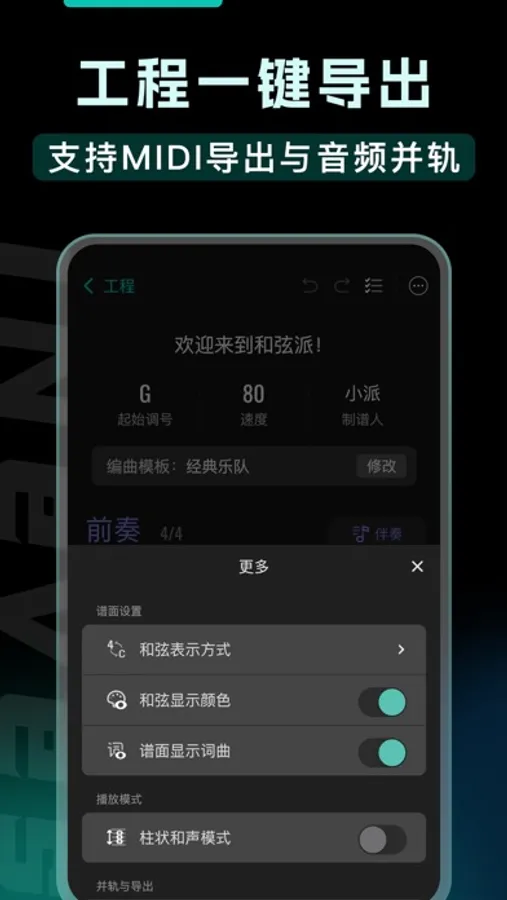和弦派支持将工程文件并轨渲染成WAV音频文件,同时支持导出多轨MIDI。