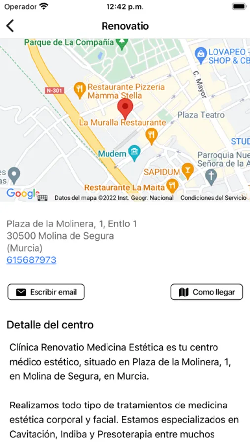 Con la APP de Clínica Renovatio Medicina Estética, centro médico estético situado en Plaza de la Molinera, 1, en Molina de Segura, en Murcia. Podrás reservar citas 24/7, accede a promociones exclusivas y modifica o cancela tus citas si no puedes acudir de forma sencilla.