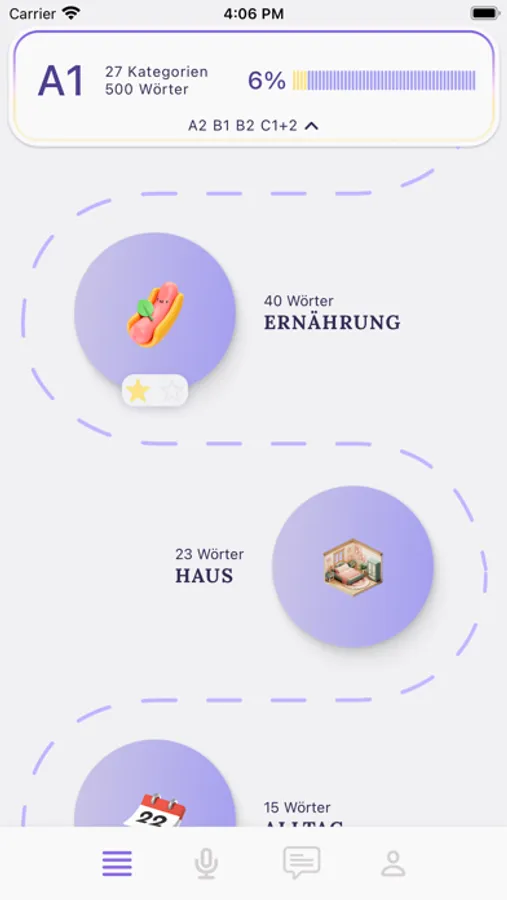 · Levels for Everyone: Progress through six engaging levels (A1, A2, B1, B2, C1/C2), each containing 500 thoughtfully chosen German words with examples, including plurals.