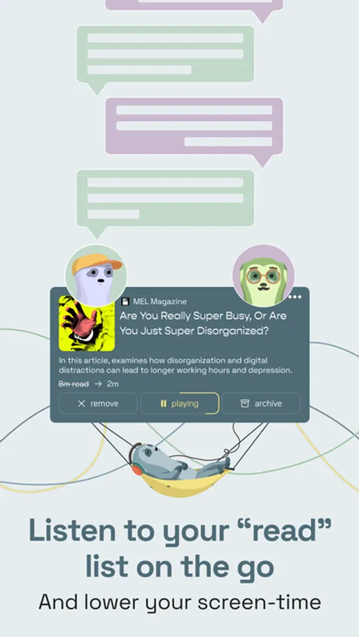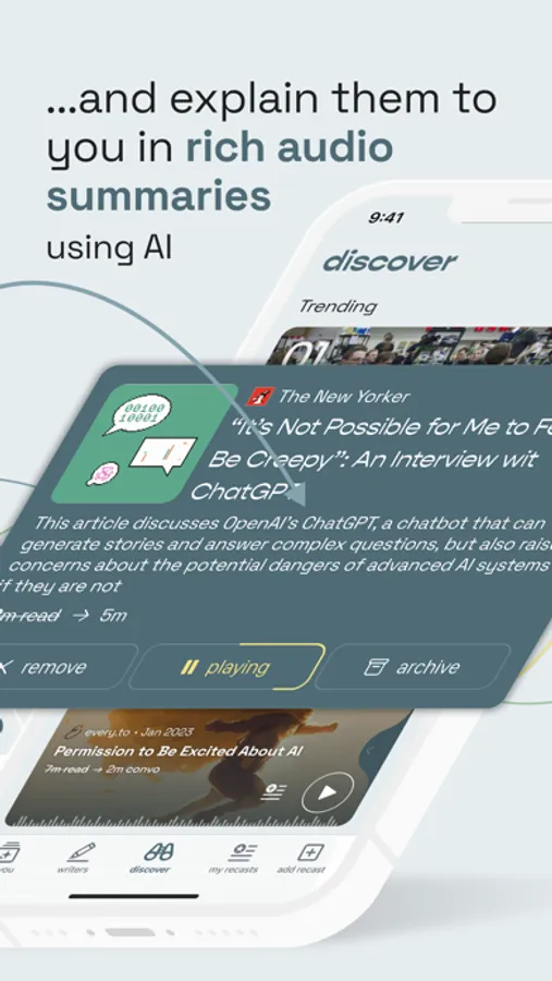 Other apps that try to help you consume news as audio tend to read out the article text verbatim. We don't think this is very easy to absorb. That's why Recast uses AI to condense the key context and takeaways of an article into just a few minutes of friendly and conversational audio.
