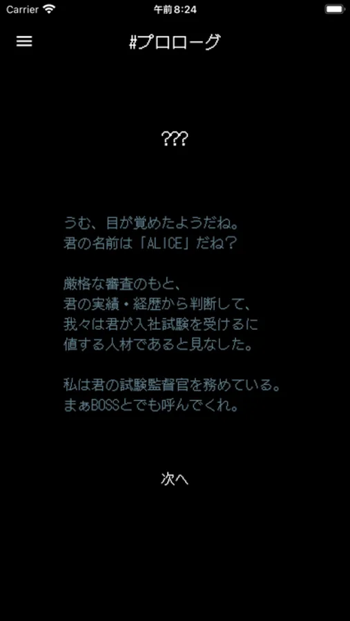 主人公「ALICE」は知らない場所で目を覚まし、「試験監督」と名乗る者から入社試験を受けさせられることに。