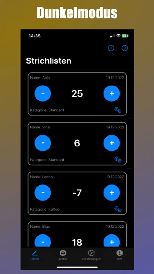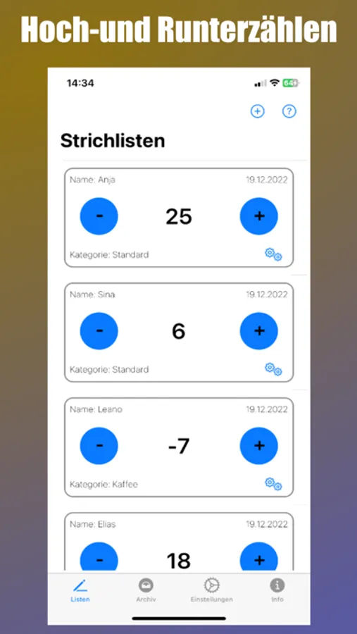Mit der kostenlosen Strichlistenzähler-App kann schnell und einfach gezählt werden. Hoch- und Runterzählen. Einfach auf den + bzw. - Button drücken.