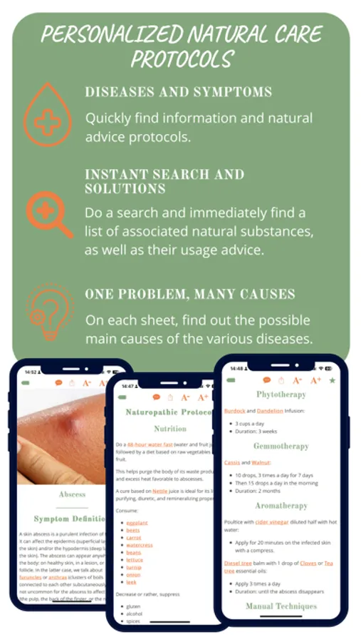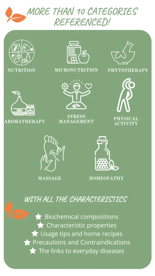 In a simple and structured way, you will find recommendations "at first intent" to get to the essentials, then "in addition" if you want an approach beyond the symptoms, based on the search for the cause; and finally to go further you will have access to specific dietary protocols, plant identification sheets, essential oils, all the micronutrients and nutrients, a whole encyclopedia of naturopathy to help you in your daily life.