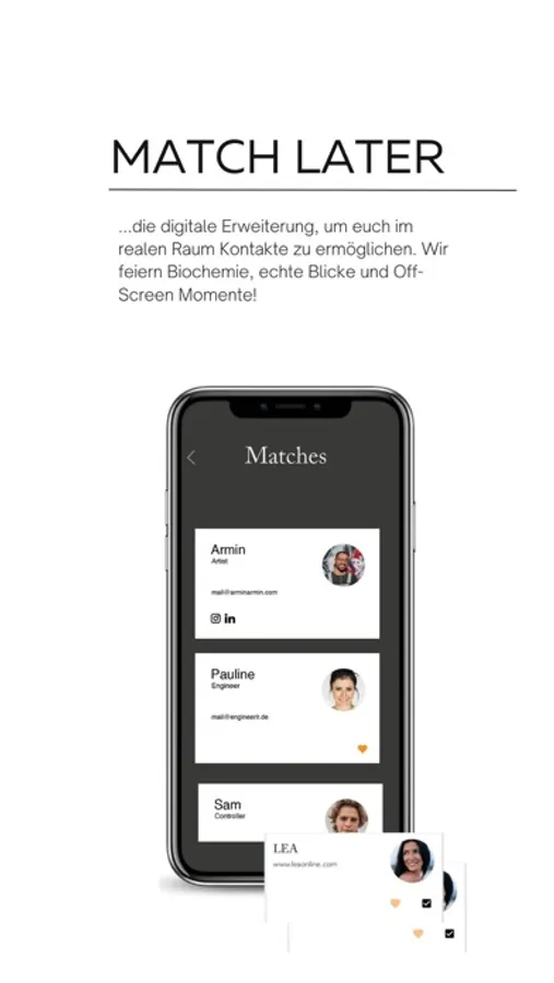 In this way, we enable relaxed networking, new friendships and discreet dating - if there is mutual interest: A heart symbol on the card stands for "dating".