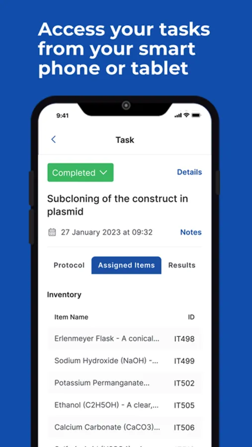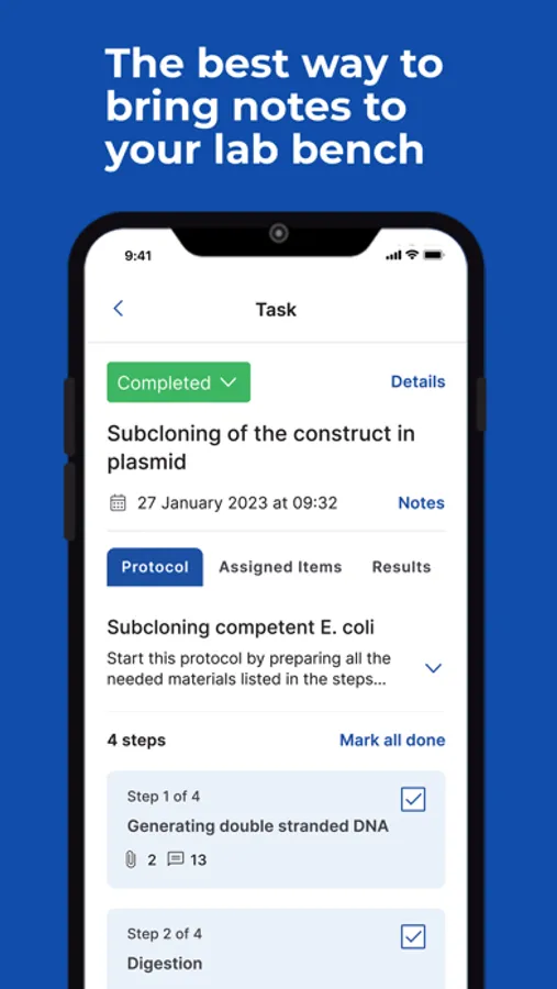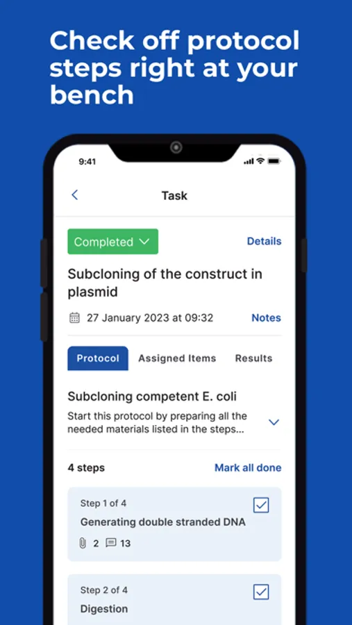 Monitor the progress directly in the app by completing the protocol steps on the fly. Step attachments can be downloaded and opened on your device. You can also add comments to protocol steps or read those added by others. Open the task details, notes, and protocol description when needed.