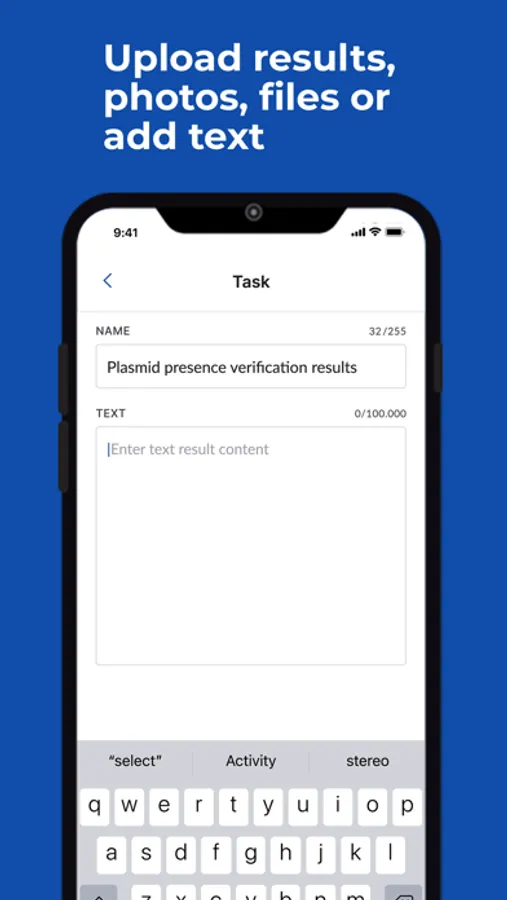 Spend less time writing your notes and recording results. Simply create text results and attach images or other files to the task results directly in the app. With this, you avoid copying your hand-written notes into your computer at the end of your work day. All the updates you do in the mobile app will be reflected in your web account right away.