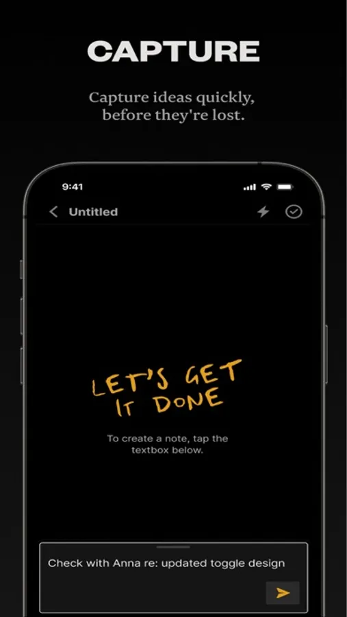 Designed for those messy, in-progress moments where important thoughts and ideas come quick and need to be captured just as quickly. Simply write your note, save it, and get back to work.