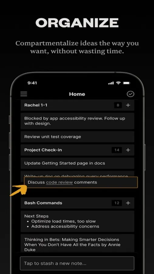 Stashpad is the note-taking app designed for your working memory. Get your thoughts out, organize them effortlessly, and return to them when you’re ready.