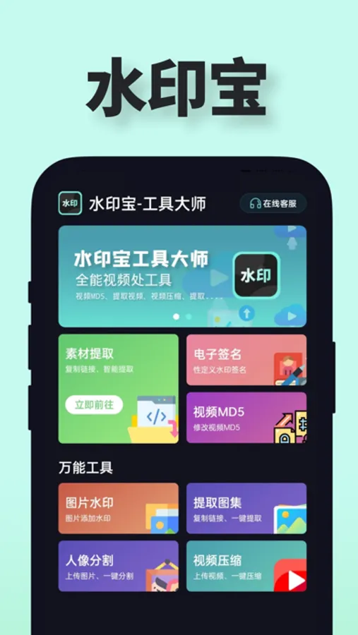 水印宝-工具大师,专业视频提取、视频解析、高清图集提取、人像抠图、图片添加水印、视频压缩、电子签名