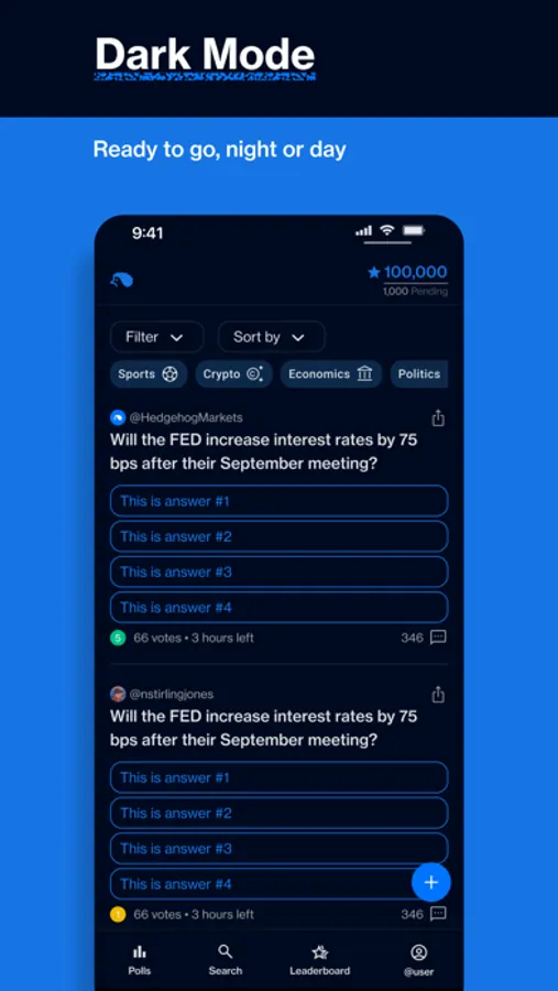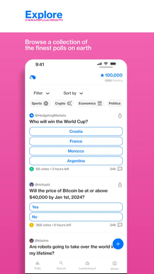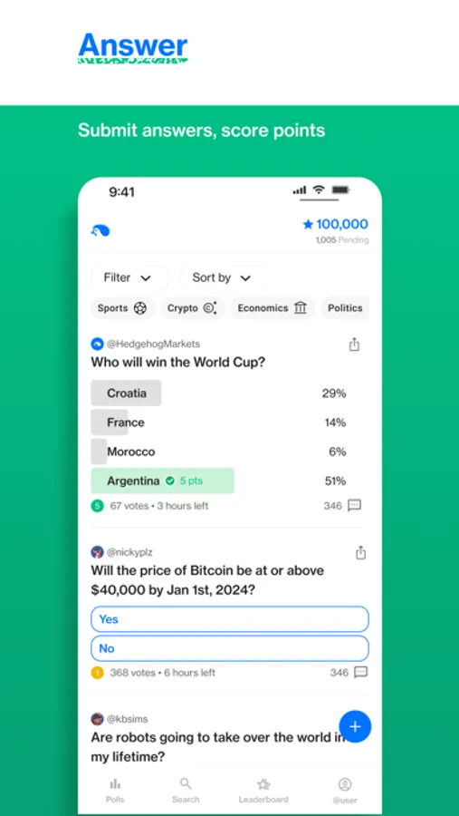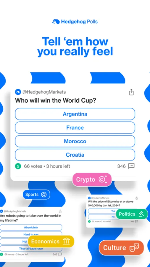 Hedgehog Polls lets you join in on predicting real world events through the power of crowdsourcing users' choices all over the world. You can create a poll, respond to polls and even comment on polls to share your thoughts and earn points along the way! You can predict sports outcomes with a single tap and earn points for selecting the correct outcome. Hedgehog Polls covers various sports including NFL, NBA, MLB, MLS, NCAA, March Madness, Super Bowl, NHL and many more. Polls can be created on any topic - even what color shoes you should wear today. Place predictions on financial outcomes like future prices of stocks, FOMC interest rate decisions, and NFT floor prices or find markets about what the weather will be like in Chicago next week. Place predictions on anything with our unique prediction market polls platform!