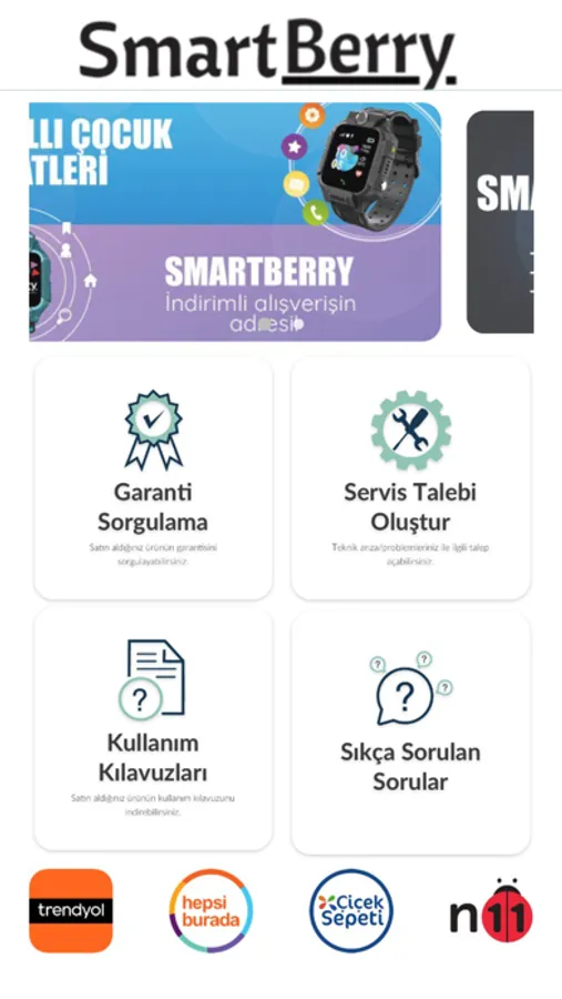 SmartBerry Türkiye mobil uygulaması ile satın aldığınız akıllı saatlerin garanti sürelerini öğrenebilir, arızalar ve teknik destek için servis talebi oluşturabilir ve saatlerinizin kullanım kılavuzlarını indirebilirsiniz.