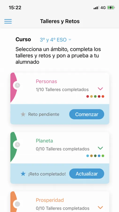 Desde la APP los docentes, tendrán acceso a distinto talleres y retos, pensados y diseñados para ser desarrollados en cursos y asignaturas específicas.