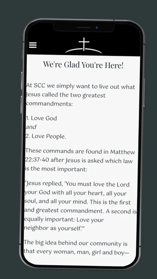 Download the app now to stay up to date with news, events, etc. At SCC we simply want to live out what Jesus called the two greatest commandments: 1) Love God and 2) Love People. The big idea behind our community is that every woman, man, girl and boy—every age, every ethnicity—would find a home in God. This is a home where they belong. God has made us a family, and we want to be a community that operates as a family.