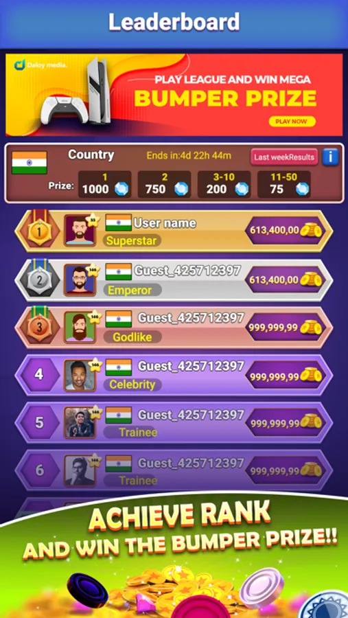 6. Leaderboard: Secure your place on the weekly leaderboard and win exciting prizes & Coins. If you secure your position on the leaderboard while being in the first to the ninth level, you get the Brass position with 6000 coins. You get 12000 coins in the Bronze level and 20,000 in the Silver. In Gold, you secure 250 gems, 350 in Platinum, and so on.