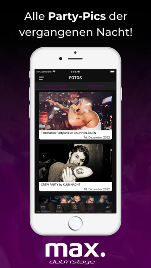 Du erfährst als erster, wann die nächste Party steigt und profitierst dabei noch von fetten Aktionen. Zum Event sparst du mit unseren Gutscheinen bares Geld. Damit du dich am Tag danach auch an den geilen Abend erinnern kannst, stellen wir alle Party-Pics in der App bereit.
