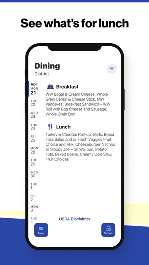 Within the dining section, you'll find an easy to navigate, weekly menu, sorted by day and meal type.