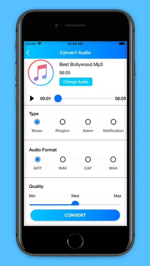 This feature converts audio files for many purposes, like...Audio for Music, Ringtone, Alarm, and Notification. also, adjust the audio format like... AFF, WAV, CAF, Mp4. and converted audio save file change quality like Minimum, Medium, and Maximum.