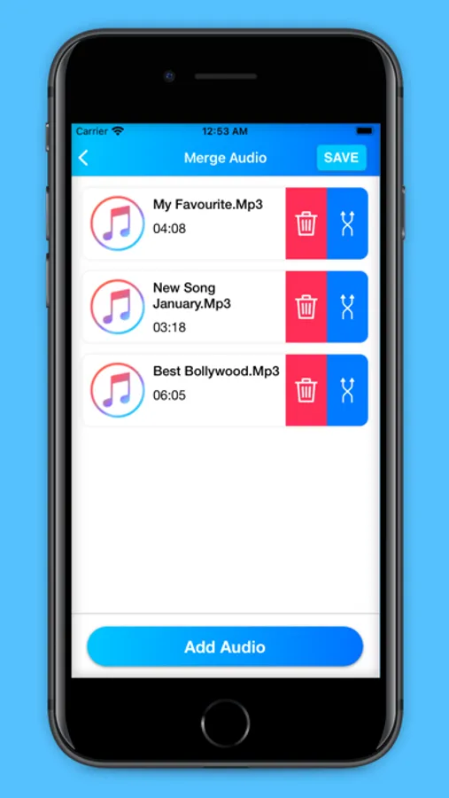 This feature merges one and more audio files. also, adjust all audio file orders to merge.