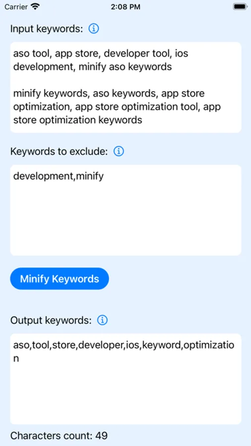 To use MinifyASO, simply enter your ASO keywords into the "Input keywords" field. You can separate these keywords using spaces, commas, or new lines.