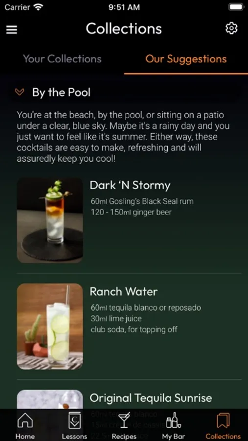 - Curated collections so that you can try new cocktails based on a particular theme. These themes range from "Exploring Tequila", to "By the Pool" and more.