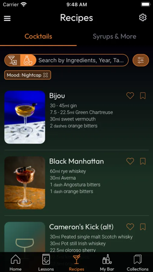 - Over 200 recipes which can be searched for based by name, ingredient, "mood", glassware, and more. You can also search by tags which can include anything from "3 ingredients", "bittersweet", or even "Disco".