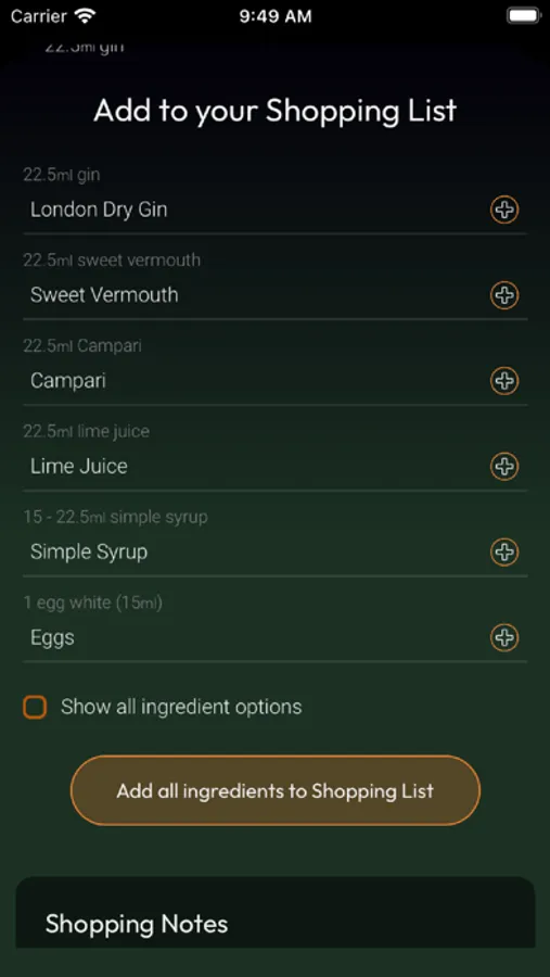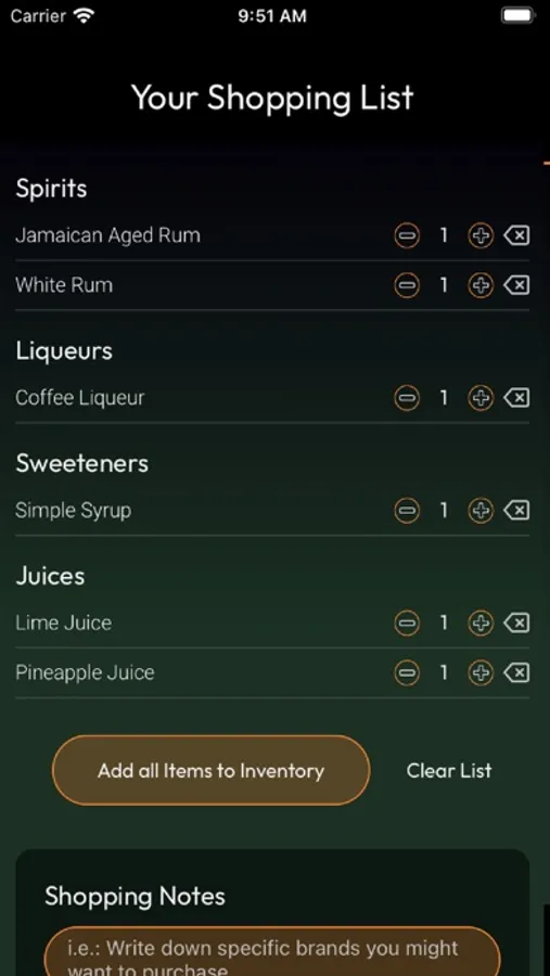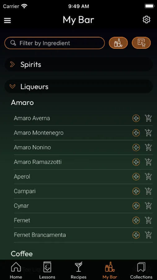 - A "My Bar" section which allows you to keep track of all the bottles and ingredients you have. The app will be able to tell you what you can make based on the ingredients you have in stock. Additionally, it offers a shopping list section so you know what to get on your next trip to the store.