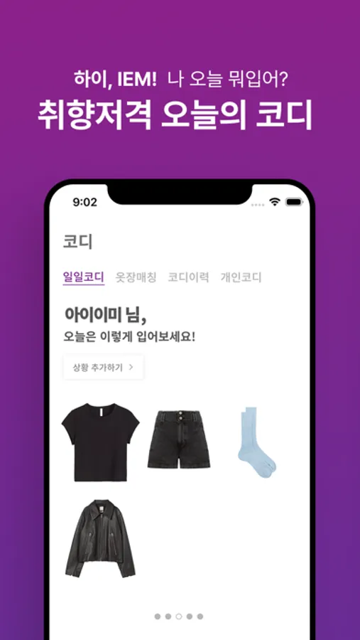 IEM가 사용자의 성향, 스타일, 최근 트렌드, 유행을 분석하여 제공하는 코디를 보고 그대로 입기만 하세요