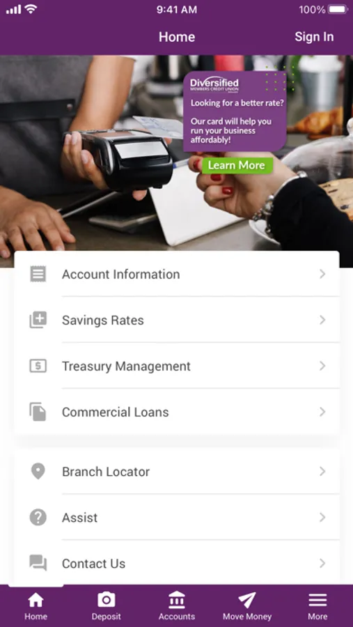 Diversified Members Credit Union Business Mobile provides members convenient access to our website, mobile check deposit, mobile banking, branch and contact information.