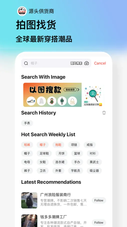 【搜索】可以通过文字或者图片,可找到最新潮流款式。