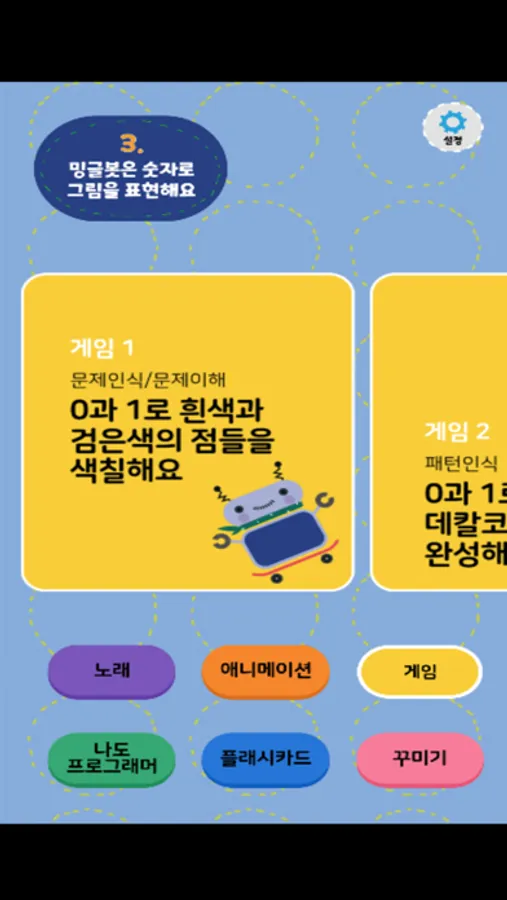 인공지능 기초 역량인 컴퓨팅 사고력 향상용 게이미피케이션으로 컴퓨팅 사고력의 개념과 원리(패턴 인식, 분해, 추상화, 알고리즘, 디버깅, 응용, 적용 및 최적화, 프로그래밍 등)을 게임화 한 인터렉티브앱이다. 게이미피케이션 기반 AI 기초 융합 키트인 *밍글봇과 상호 응용이 가능하도록 개발된 인터렉티브 앱이다.