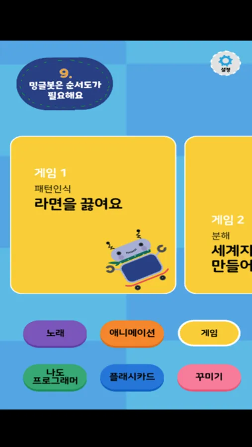 인공지능 기초 역량인 컴퓨팅 사고력 향상용 게이미피케이션으로 컴퓨팅 사고력의 개념과 원리(패턴 인식, 분해, 추상화, 알고리즘, 디버깅, 응용, 적용 및 최적화, 프로그래밍 등)을 게임화 한 인터렉티브앱이다. 게이미피케이션 기반 AI 기초 융합 키트인 *밍글봇과 상호 응용이 가능하도록 개발된 인터렉티브 앱이다.