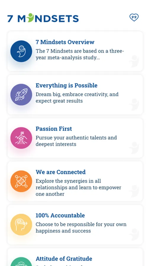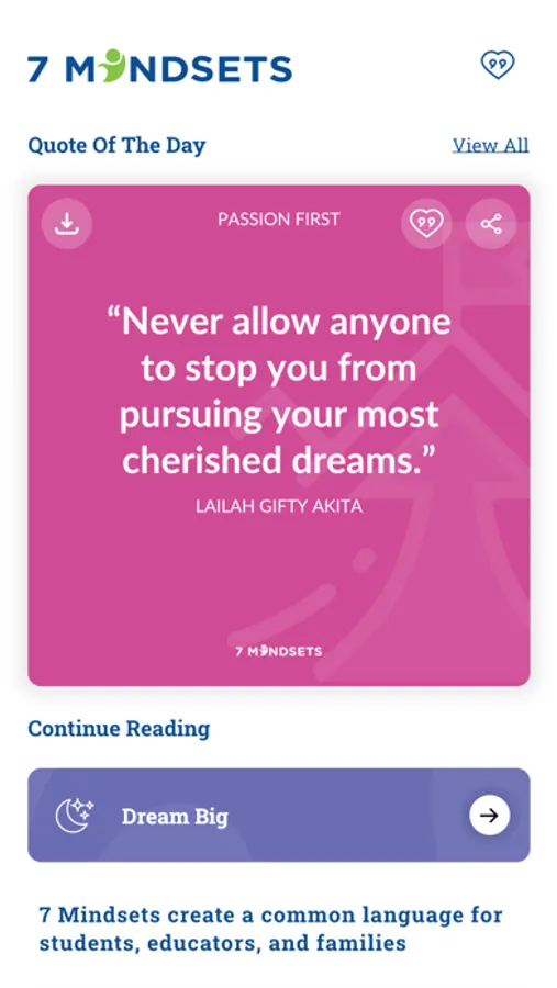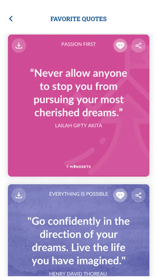 The 7 Mindsets app provides users a free introduction to the 7 Mindsets to live their ultimate life and daily mindsets-focused inspirational quotes. Users will learn the Mindsets and how to effectively apply them to their life for increased hope, authenticity, connection, passion, and joy! The daily inspirational messages reinforce the mindsets and critical attitudes that allow every individual to grow and flourish. Users can save their favorite inspirational quotes and easily share them to Instagram, Facebook, Twitter, email, and more. The 7 Mindsets app provides our world-wide community of young people and adults with a simple, practical way to lead a happier life each day.
