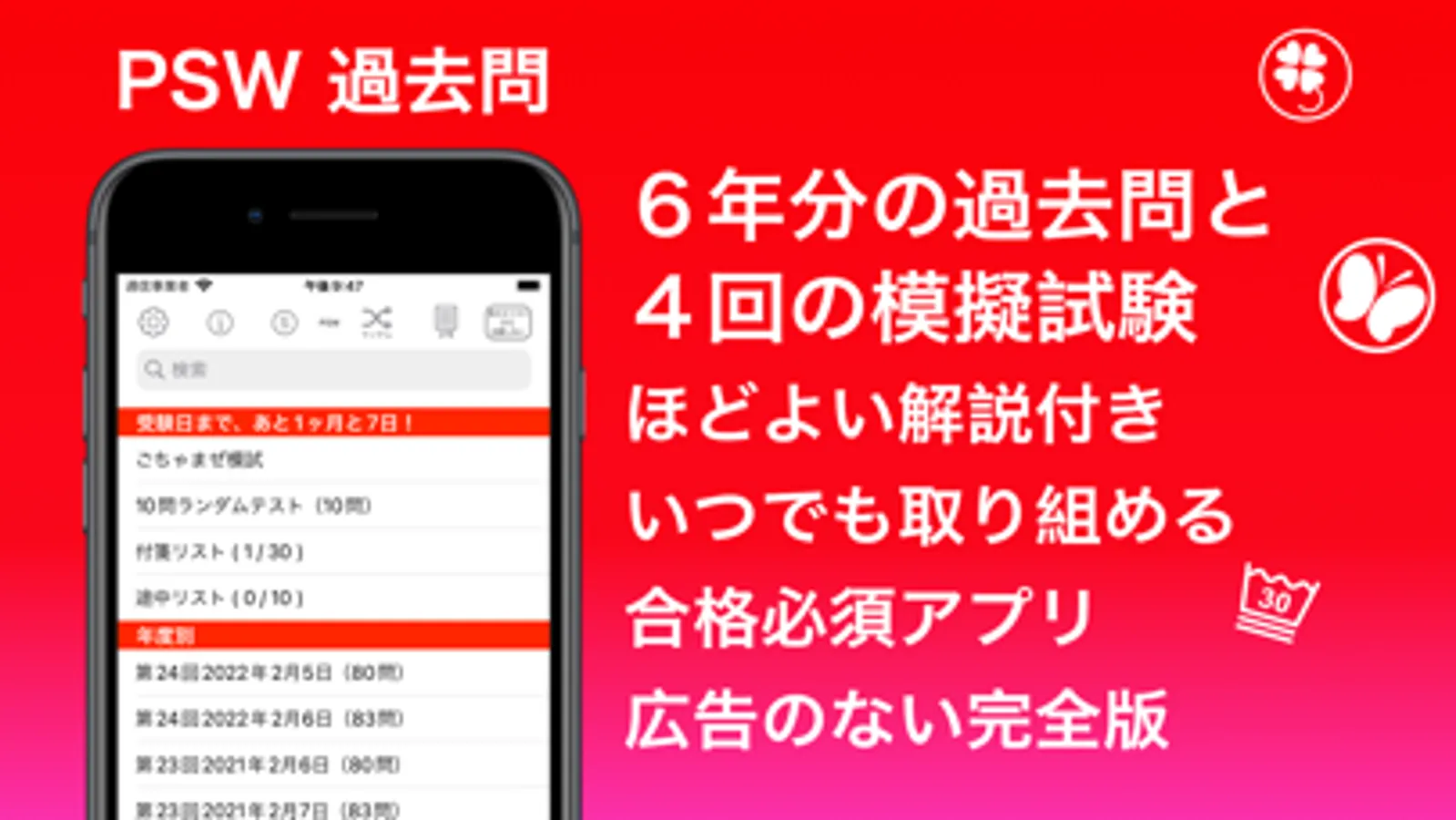 精神保健福祉士の過去問をアプリ化。過去問検索やマイリスト機能。ランダム10問テストなど、国家試験を受験した時に、あったら良かったと思う機能を搭載しています。広告がなく、スムーズに勉強することができます。更新も有料版を優先して行います。