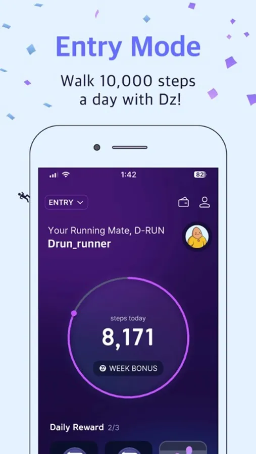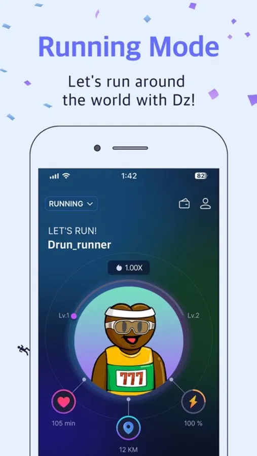 D-RUN includes fun elements such as character level up and point rewards to motivate running.