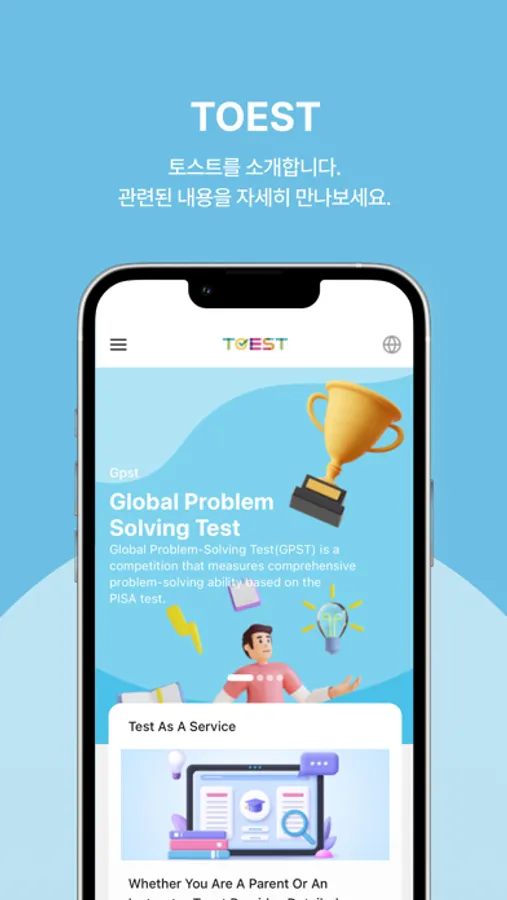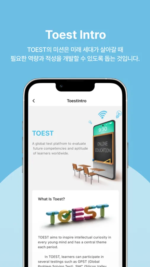 TOEST의 미션은 미래 세대가 살아갈 때 필요한 역량과 적성을 개발할 수 있도록 돕는 것입니다. TOEST에서 학습자는 온라인으로 진행되는 글로벌 문제해결력 시험(GPST), 실리콘밸리 수학 시험(SMC), e~Test(컴퓨터 활용능력 검정) 등과 같은 다양한 테스트에 참여할 수 있습니다.