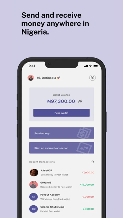 Pact provides you with a secure platform to create escrow transactions and securely receive payments for products or services. You can also make secure payments for purchases and send or receive money to and from anyone in Nigeria.