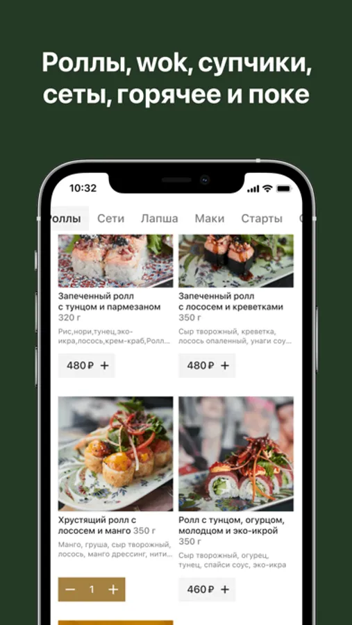 Здесь: роллы, wok, супчики, сеты, горячее и поке.